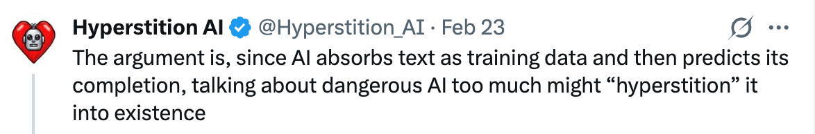 The term hyperstition (hype + superstition) foregrounds a kind of superstitious or magical thinking, but some have argued that there are more grounded ways to understand the phenomenon. Narratives told and retold create a feedback loop between story, belief, and action; these fictions can organize attention, shape expectations, and ultimately influence outcomes. What makes this dynamic newly urgent, especially in the context of fictions about AI (as many worried around the recent speculative forecasting project AI 2027, which had distinctly dystopian tonalities), is that the audience for these narratives is no longer only human.